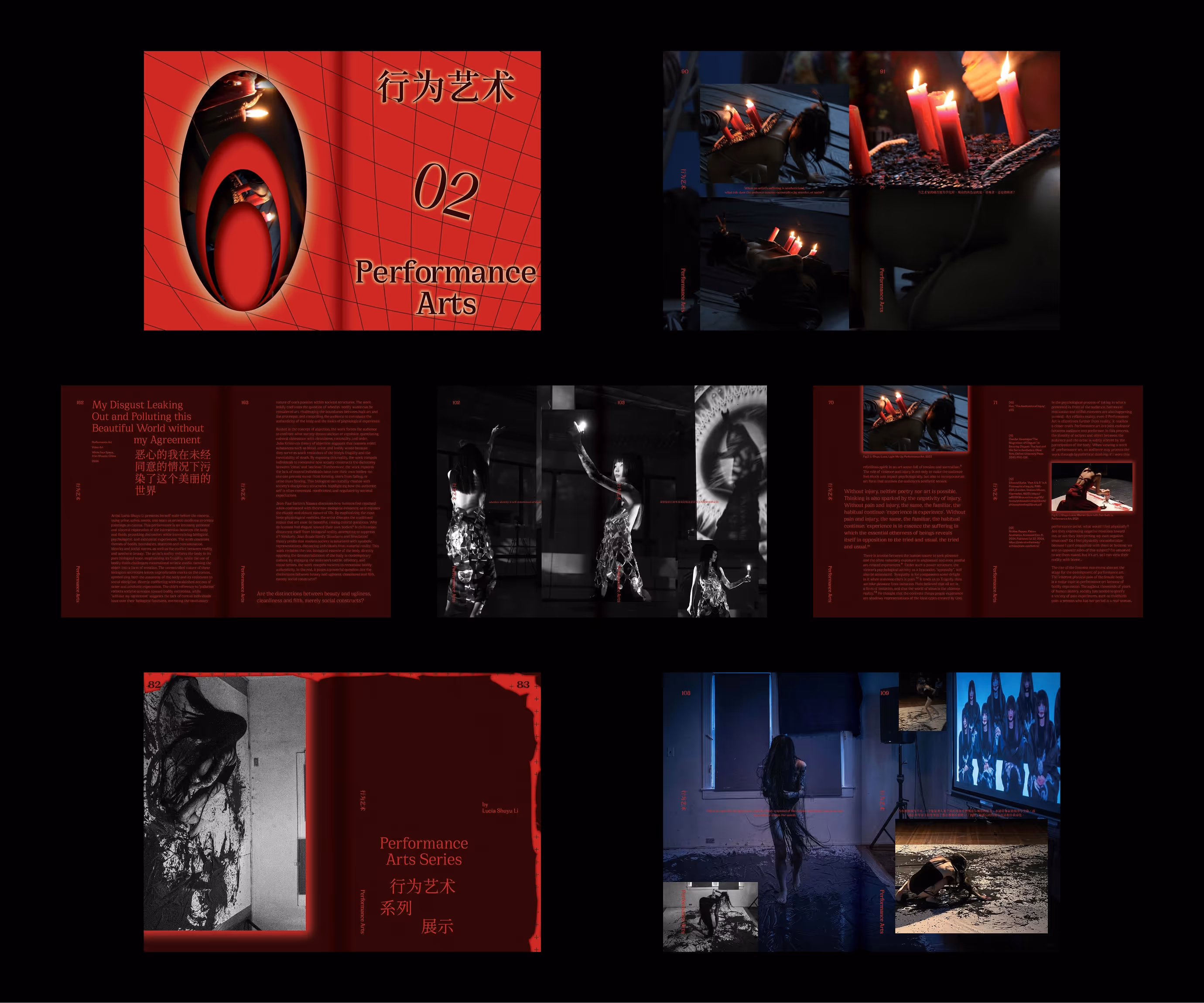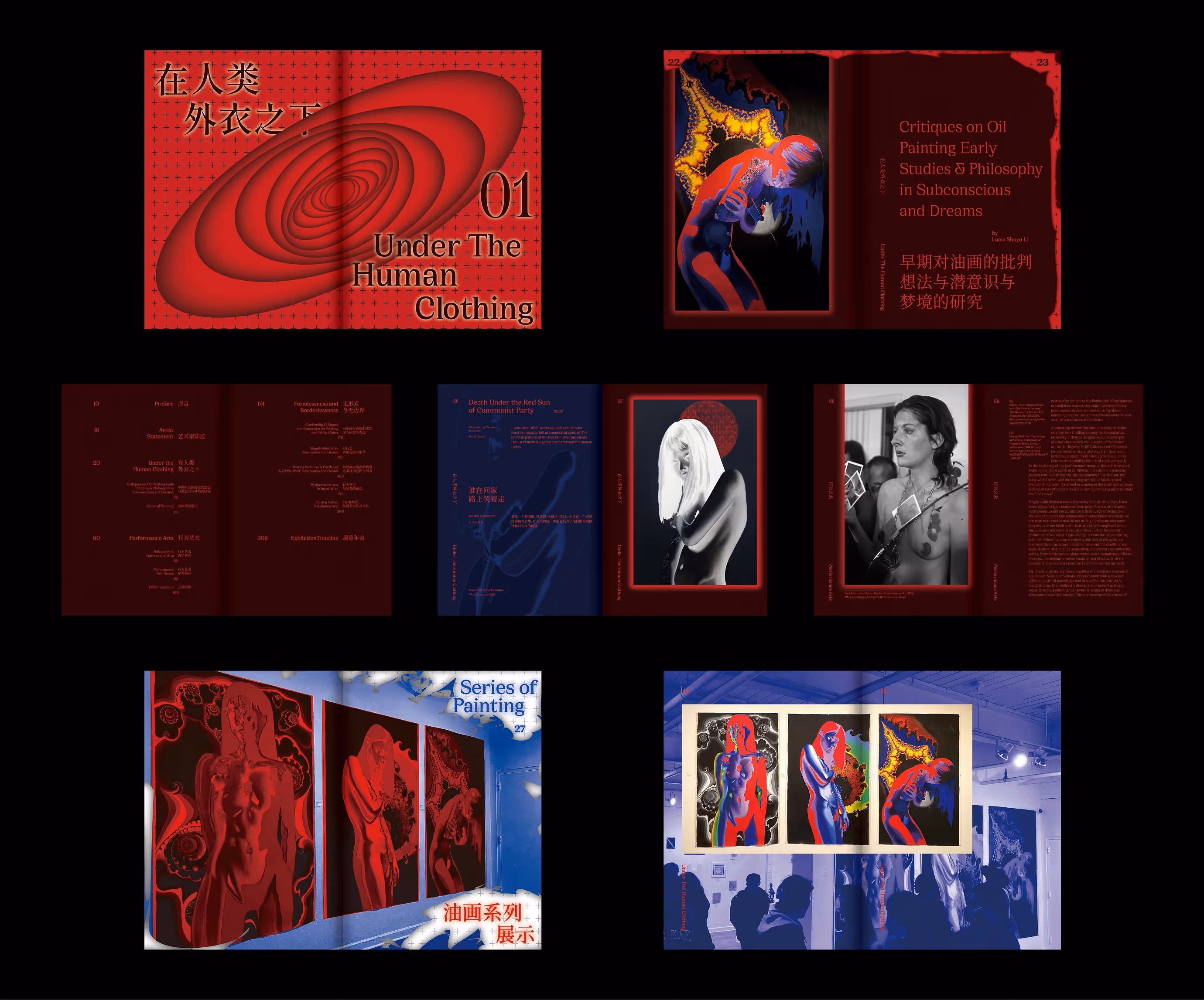 This book archives artist Lucia’s work across three core pillars: oil paintings, performance art, and installations. The design system mirrors her creative process of "rupture and reassembly" by using modular grids and intentional layout disruptions. By blending critical essays with visual archives, the publication becomes a physical exploration of the tension between rigid structure and constant change.