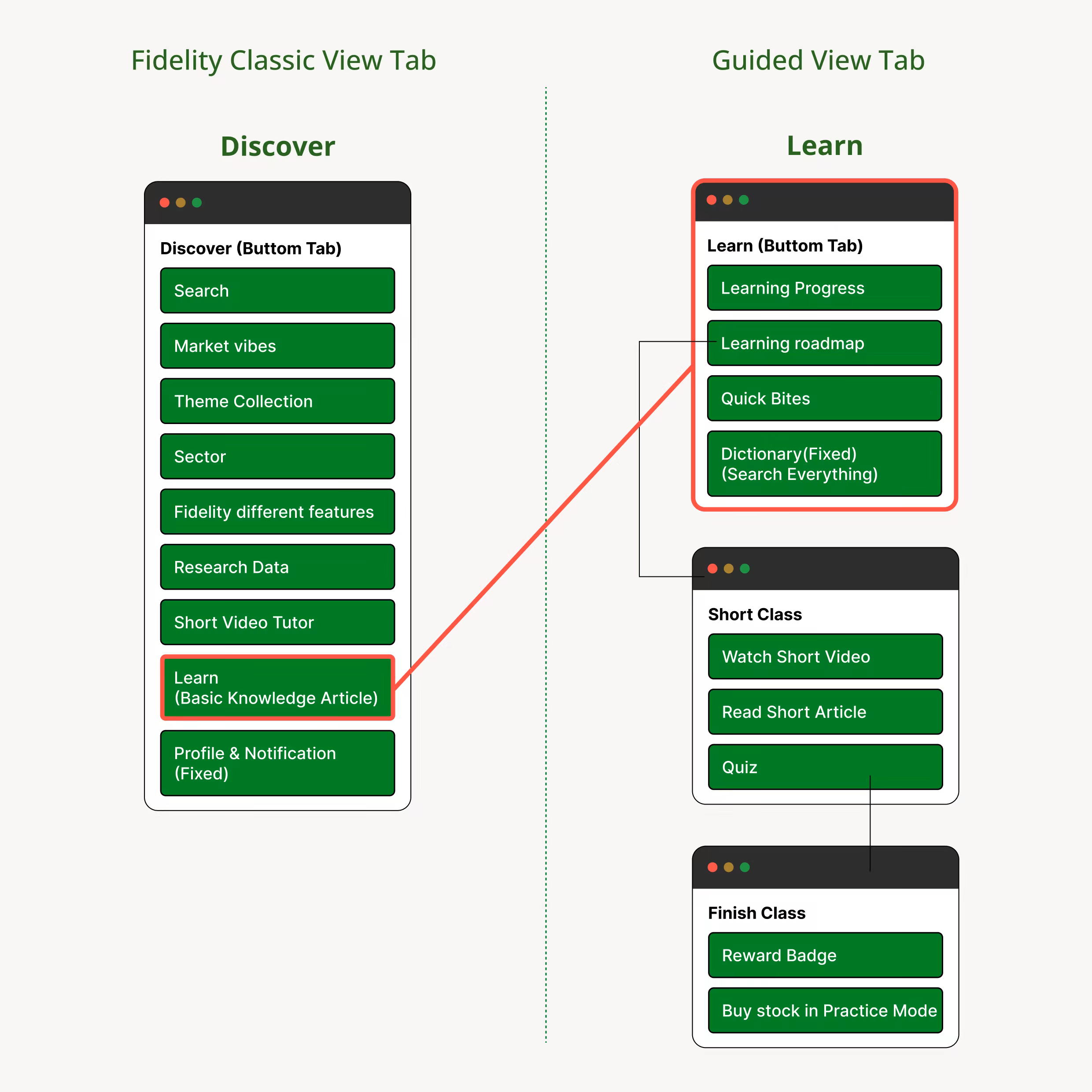 This project addresses the steep learning curve of the Fidelity app for new investors. The “Guided View” feature provides a simplified interface for easier navigation, while the “Practice Mode” allows users to simulate trading in a risk-free environment. Together, these updates lower the barrier to entry, helping beginners build confidence in wealth management.
