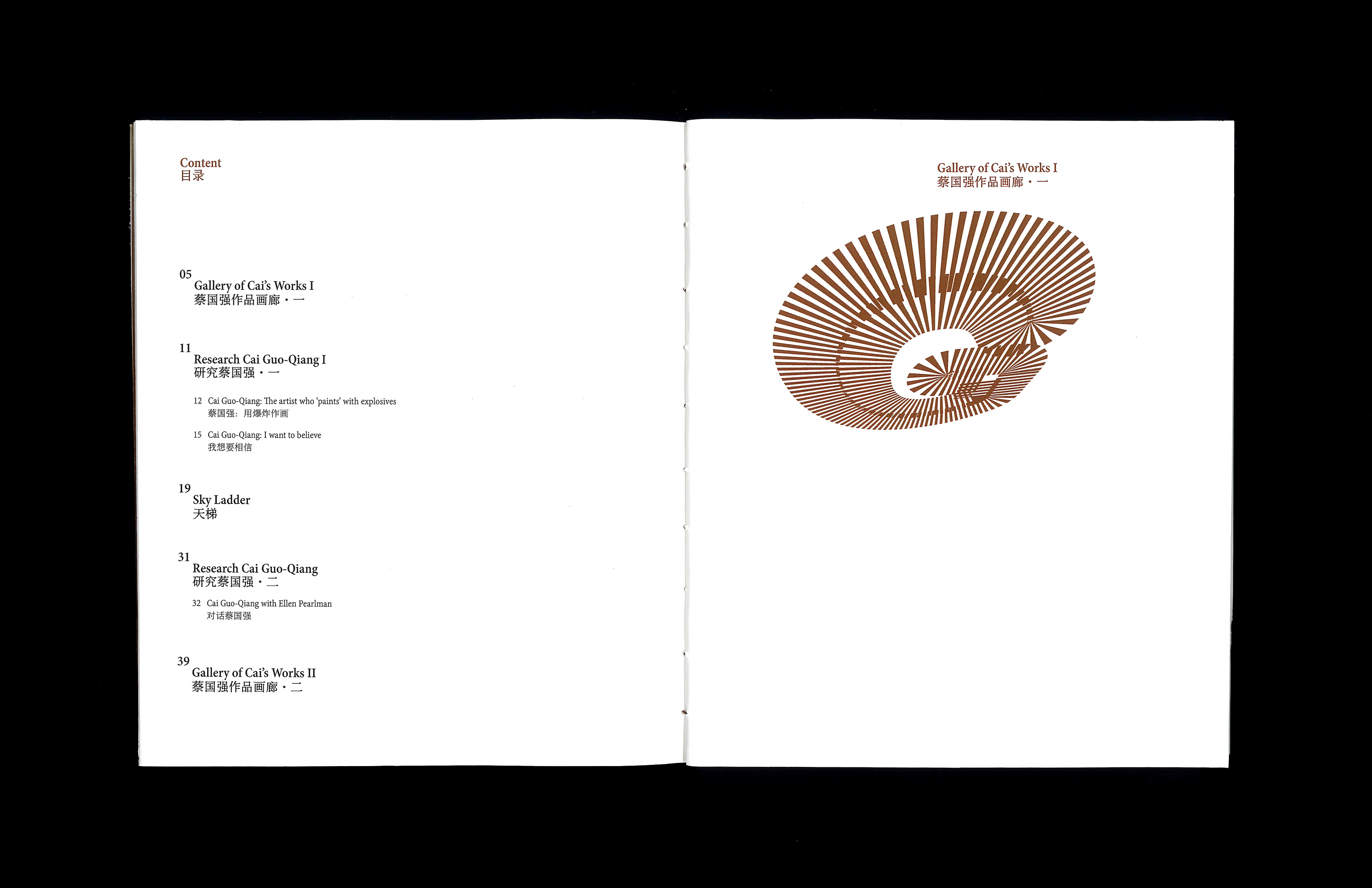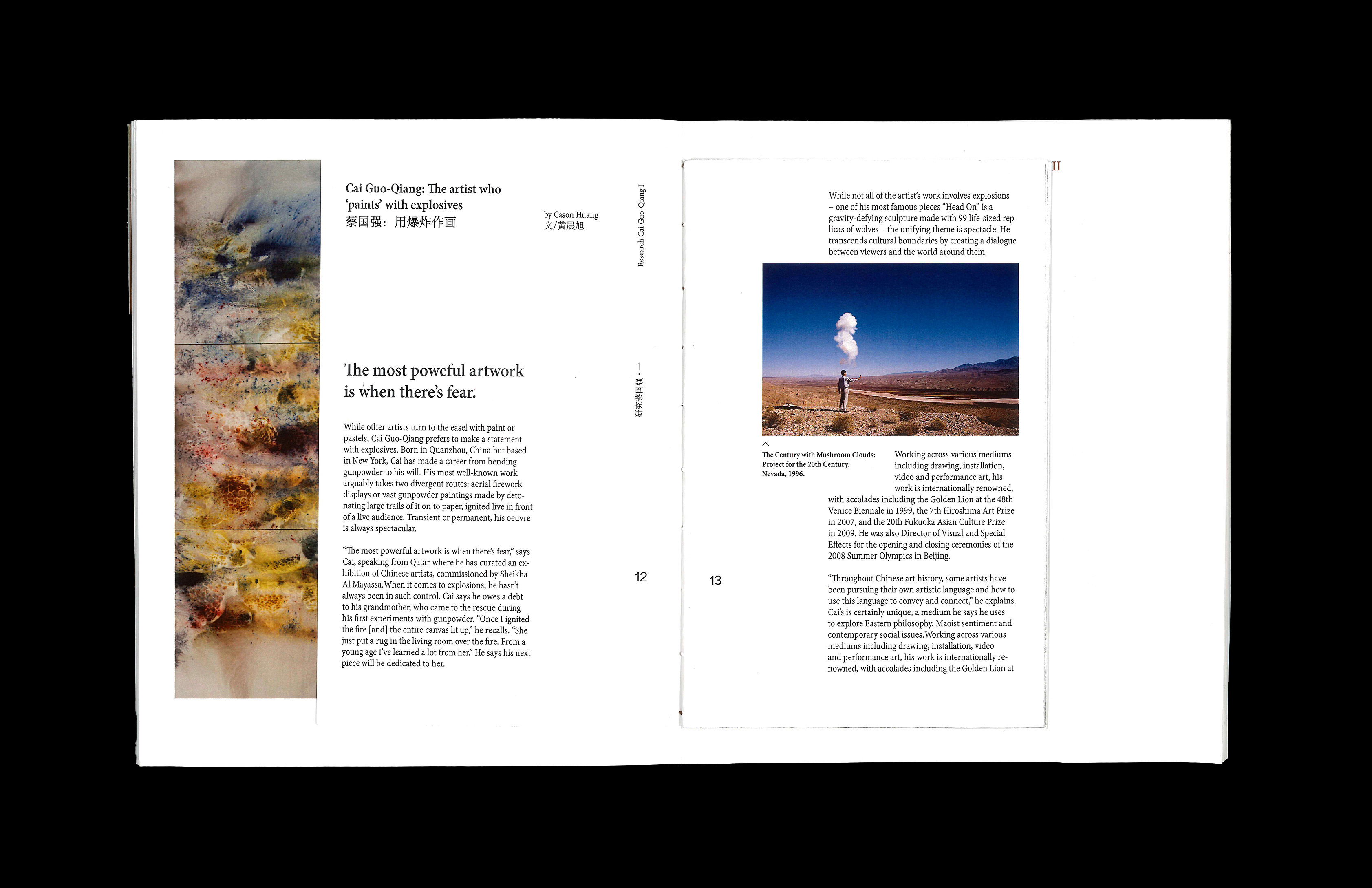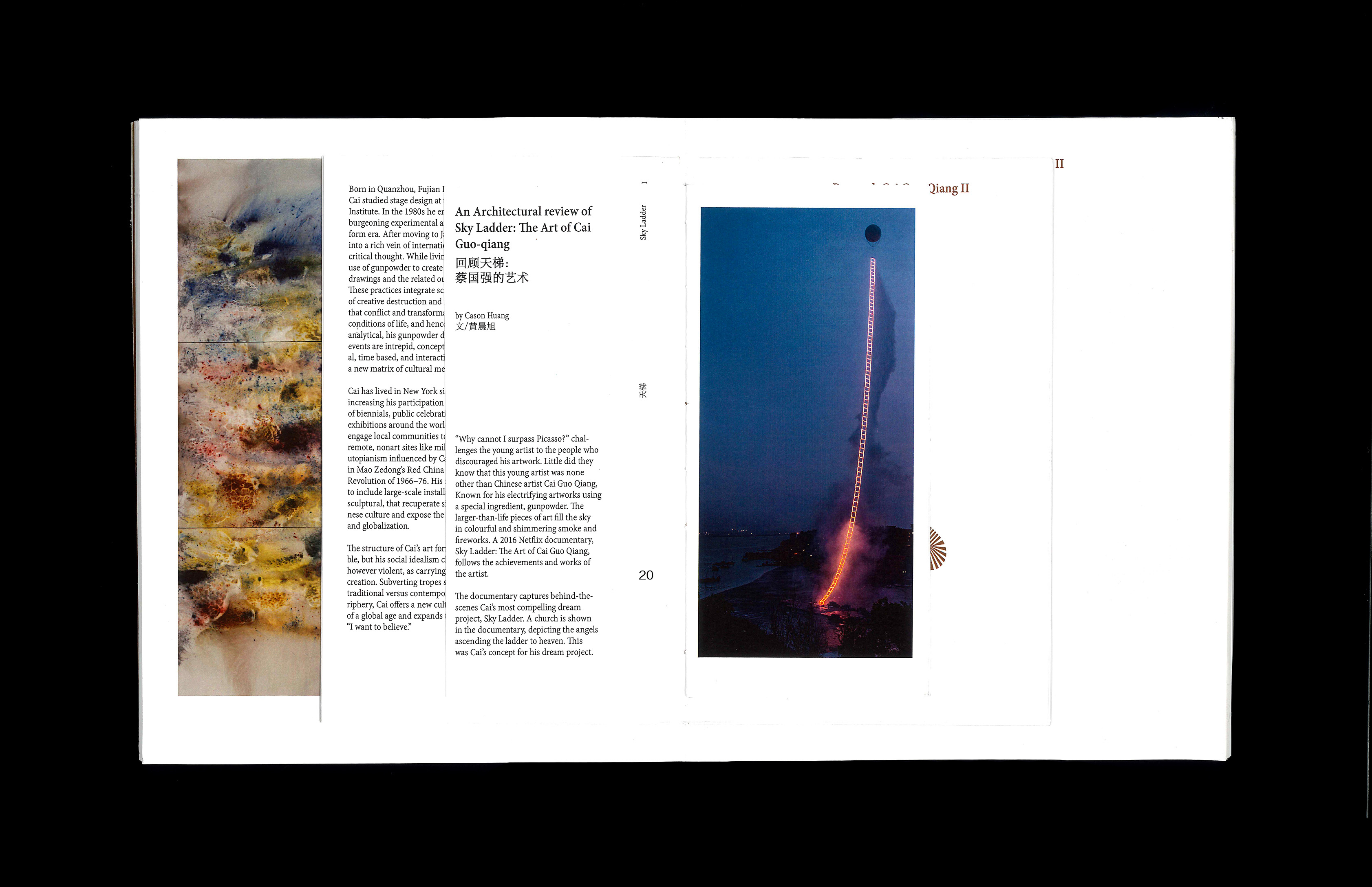 This project is a curated zine exploring the life and work of Cai Guo-Qiang. The editorial design utilizes a sophisticated structural framework, where three differentiated formats correspond to specific narrative layers: his artistic philosophy, personal interviews, and the technical realization of "Sky Ladder."