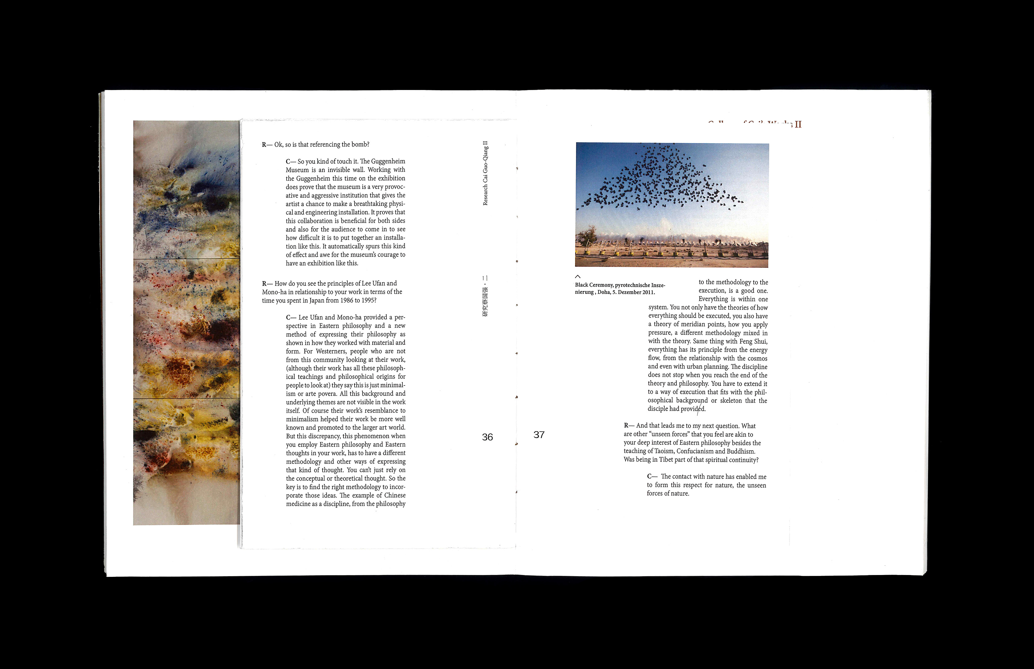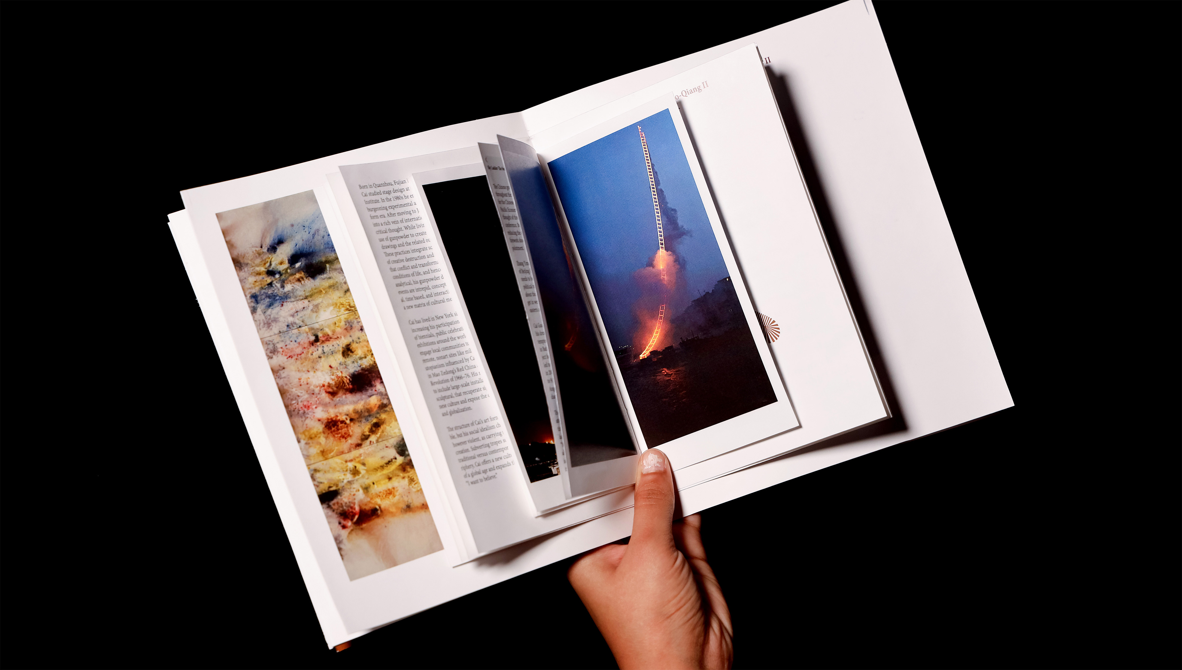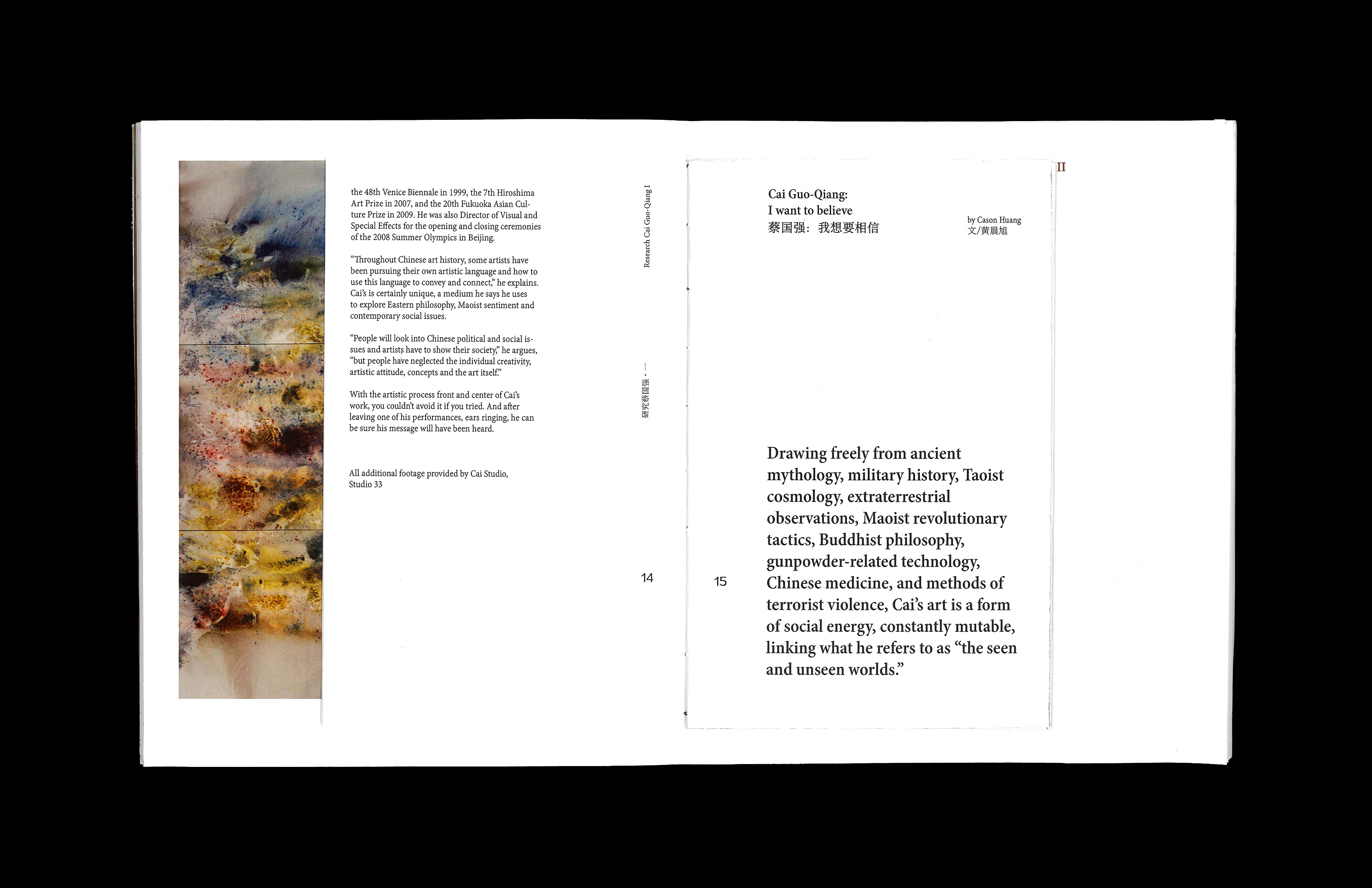 This project is a curated zine exploring the life and work of Cai Guo-Qiang. The editorial design utilizes a sophisticated structural framework, where three differentiated formats correspond to specific narrative layers: his artistic philosophy, personal interviews, and the technical realization of "Sky Ladder."