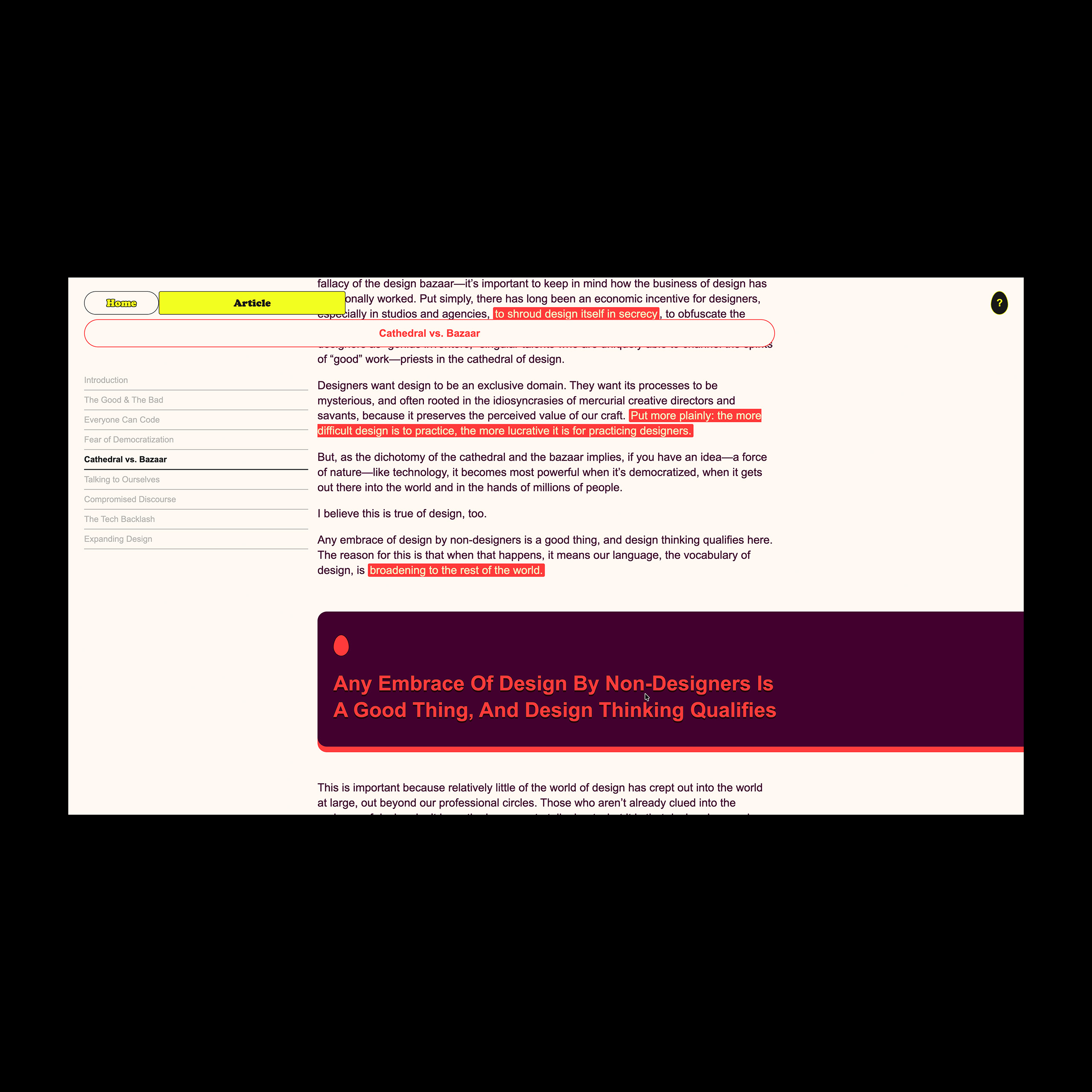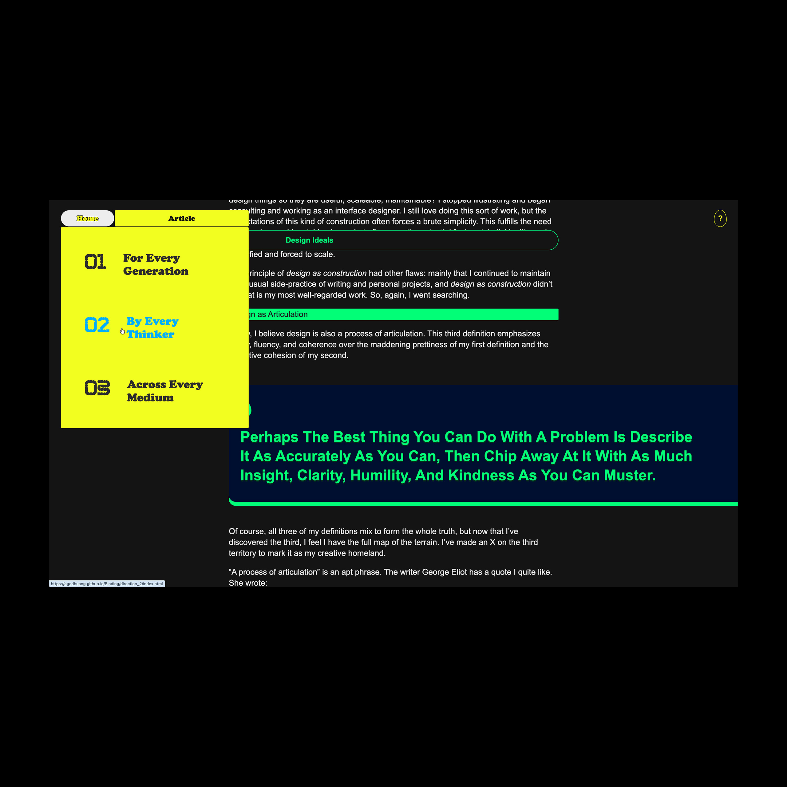 Inspired by the philosophy of "The Egg," this project is a digital manifesto divided into three thematic articles: For Every Generation, By Every Thinker, and Across Every Medium. It advocates for a universal design approach that transcends age, discipline, and platform. Visually, the site contrasts soft pill shapes with rigid rectangles to symbolize the harmony between different ideologies, using a fluid layout to turn these complex philosophical ideas into an accessible reading experience.